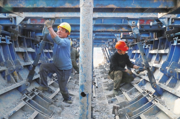 1月17日,新田县石羊镇毛俊水库新田灌区周山渡槽建设工地,工人在紧张施工。连日来,施工方抢抓晴好天气,全力推进工程建设进度。
