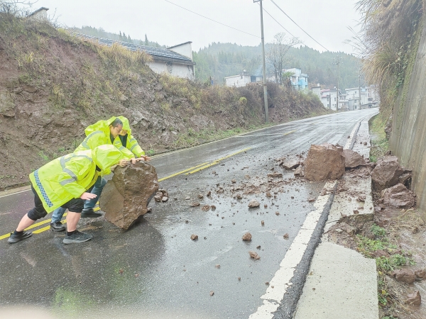 1月19日,泸溪县S320线达岚镇都用村路段,工作人员在清理落石。受冷空气影响,该县迎来新一轮低温雨雪天气,泸溪县公路建设养护中心迅速响应,加强国省干线、农村公路的安全巡查。陈宏芳 摄