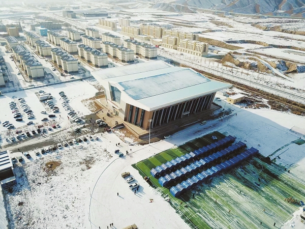 图为新疆阿合奇县科技文化体育中心应急避难场所(1月23日摄,无人机照片)。新华社 发