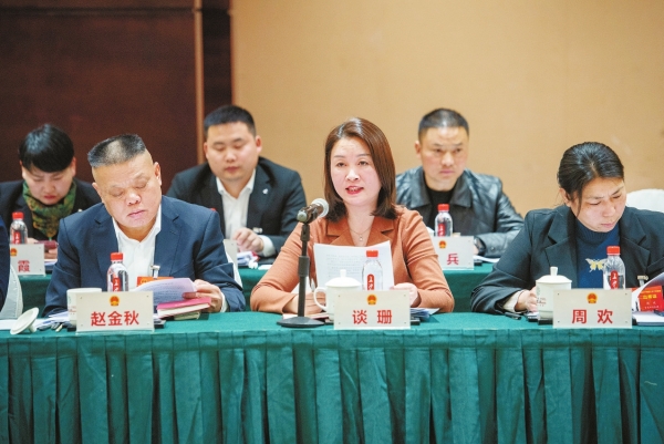 1月25日,常德市代表团谈珊代表(中)就做好普惠性托育、提升生育率建言。