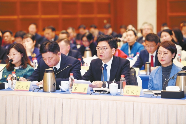 1月25日上午,易鹰委员(前排右二)在联组会上就以长沙为龙头打造沿湘江工业旅游走廊发言。湖南日报全媒体记者 田超 摄