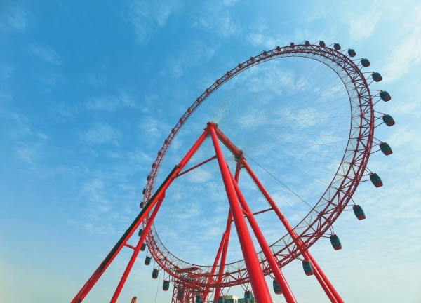 “湘潭眼”摩天轮高128米。结合湘潭的红色基因,摩天轮以红为底色。视觉冲击感十足的摩天轮,吸引不少游客拍照打卡。