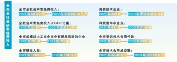 2023年,全社会研发经费投入强度达到2.29%;科技型中小企业入库2149家,增长135%;高新技术企业预计突破610家,增长24%以上;登记技术合同2053项,增长240%;认定技术合同成交额232亿元,同比增长348%;知识价值信用贷款累计备案金额达4.07亿元,完成年度目标的203.5%;知识产权质押融资贷款1.75亿元,完成年度目标的870%……郴州科技进步指数均居全省前列。