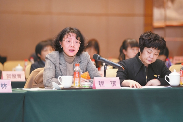 1月25日,娄底市代表团程蓓代表(左)就以综合金融服务破解中小微企业融资难题建言。湖南日报全媒体记者 辜鹏博 摄