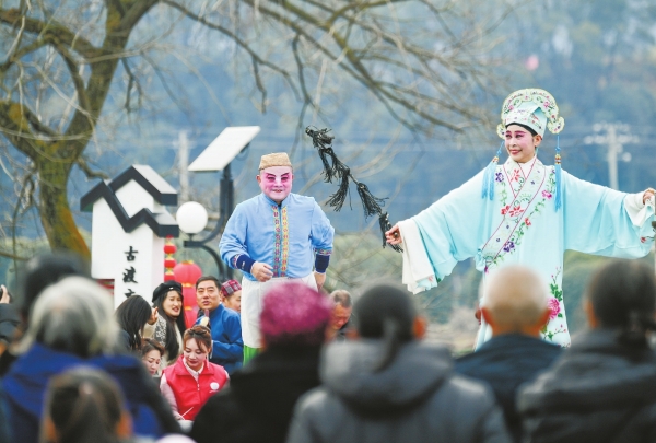 1月26日,花鼓戏演出吸引不少观众驻足观看。当天,浏阳市“我们的中国梦·文化进万家”活动在枨冲镇举行,舞龙、舞狮、竹马灯等非遗项目展演,剪窗花、送春联、文化惠民演出等系列活动精彩纷呈,让观众感受到浓浓的年味。