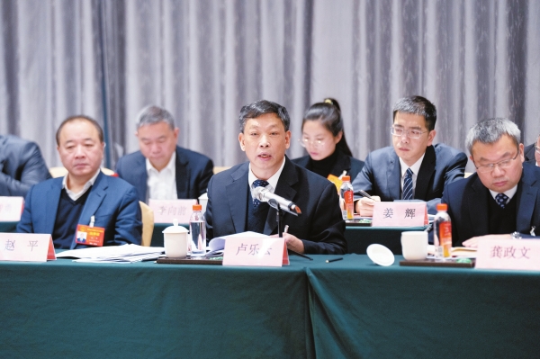 1月27日,益阳市代表团卢乐云代表(前排中)在审议省人大常委会和省“两院”工作报告时发言。