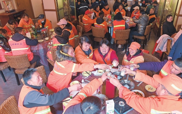 1月29日中午,长沙市雨花区高桥街道的70余名环卫工人欢聚一堂,共享新春团圆宴。当天,“长沙好人”张尚友邀请一线环卫工人吃团圆宴并赠送新年礼包,感谢他们为城市所做的贡献。这是他连续15年开展此活动。湖南日报全媒体记者 徐行 通讯员 王国光 摄影报道