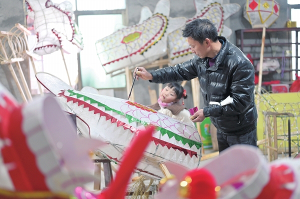 1月28日,双峰县杏子铺镇泉坝村,民间手艺人朱林坤在为火龙灯“龙尾”描鳞片。春节临近,朱林坤加班加点赶制火龙灯,迎接龙年的到来。舞火龙灯在当地已有400多年的历史。 李建新 周伟华 摄影报道(湖南图片库)