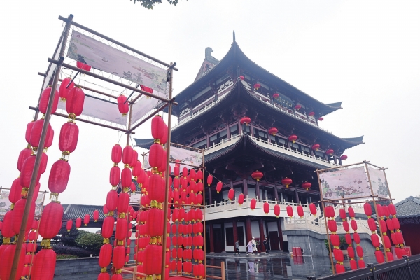 1月29日,长沙杜甫江阁灯笼高挂,游客在游园赏景。新春将至,长沙各大景区商场装扮一新、张灯结彩,营造出喜庆祥和的氛围。