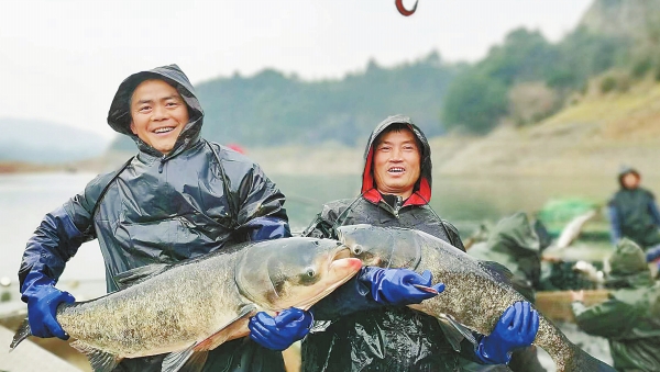 1月30日,捕捞人员怀抱重达20多公斤的“鱼王”,喜悦之情溢于言表。当天,沅陵县岩屋潭水库开始冬捕,起网6万多公斤生态鲢鱼,吸引了重庆市以及省内常德、益阳等地的渔业经销商上门调购生态鱼。去年,当地农业开发企业在库区投入优质鱼苗进行生态放养,既保护了生态,又确保了渔业收益。刘纯意 摄(湖南图片库)