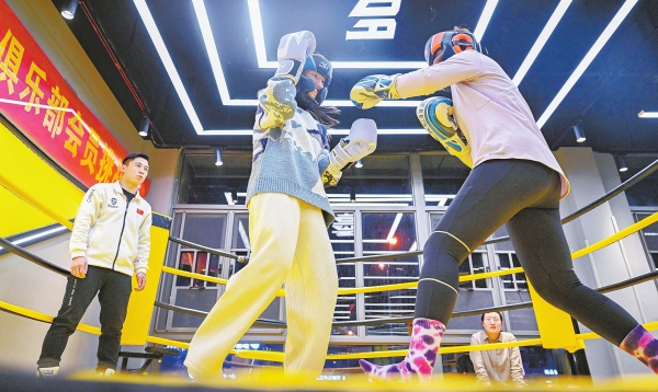 1月8日晚,长沙市岳麓区美达搏击俱乐部,邓女士(右)和刘女士在老师的指导下进行拳击对抗训练。她俩在附近上班,平时工作压力大,就上夜校练习拳击解压。 |