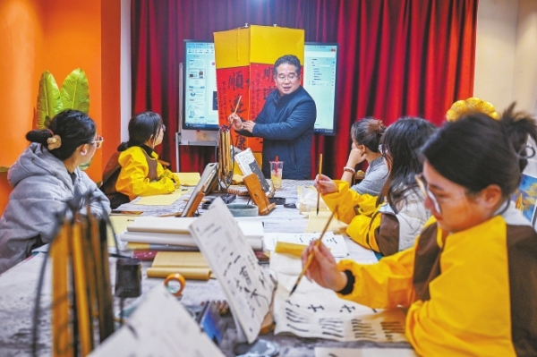 1月9日晚,长沙市雨花区青叶堂书画教室,夜校书法老师范晓亮(中)在指导学员握笔技巧。 |