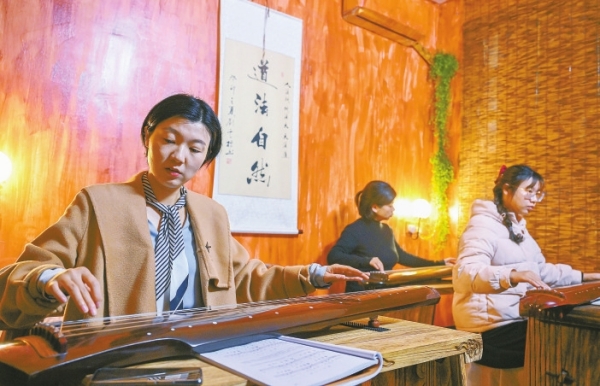 1月10日晚,长沙市天心区城南路街道火药局巷“道之古琴社”,在传媒公司工作的学员顾一西(左一)跟随古琴老师练习弹奏技巧。“夜校让我更期待下班后的生活,每周抽出一两小时,放下手机,静下心来弹奏古琴,感觉很美妙。” |