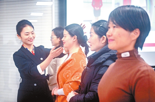 1月22日晚,长沙市群众艺术馆“市民夜校”礼仪公益培训班上,夜校老师在指导学员进行仪态训练。 |
