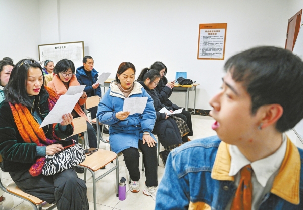 1月22日晚,长沙市群众艺术馆“市民夜校”流行声乐公益培训班上,夜校老师在指导学员练习发声技巧。该课程颇受学员青睐,20个免费名额很快被一抢而光。 |