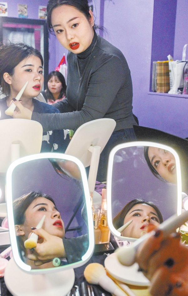 1月23日晚,长沙市芙蓉区都正街桃花井附近,一个占地约30平方米的工作室,以打造“年轻人的文化聚集地”为宗旨的“一间夜校”招牌亮了起来,培训师向学员教授化妆技巧,10余名学员听得津津有味。