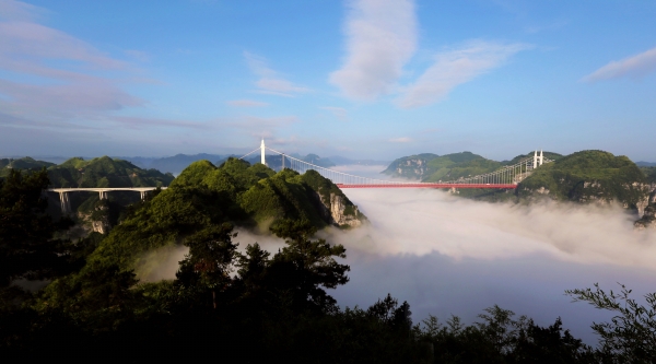 湘西的崇山峻岭间,跨度1176米的矮寨大桥宛如一条彩练,在山路十八弯上空飞跃,桥上车辆川流不息。
