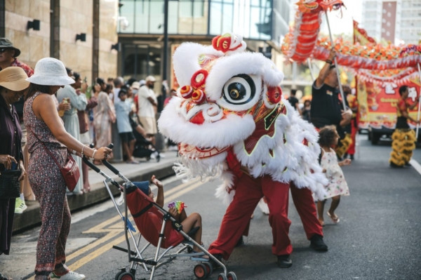 2月3日,由中国驻毛里求斯大使馆、毛里求斯艺术和文化遗产部、毛里求斯中国文化中心、华社联盟等联合举办的2024年“欢乐春节”花车巡游活动在毛里求斯首都路易港举行。中毛两国各界友好人士800余人参加此次活动。图为当日,在毛里求斯首都路易港,参加2024“欢乐春节”花车巡游活动的演员与现场观众互动。