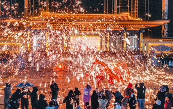 2月4日晚,蓝山县民间艺人在表演非遗“火龙钢花”。时值立春,当地举办丰富多彩的民俗活动,喜迎新春。