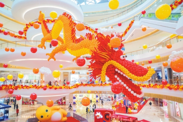 2月8日,长沙步步高·星城天地商场,龙年装饰栩栩如生。