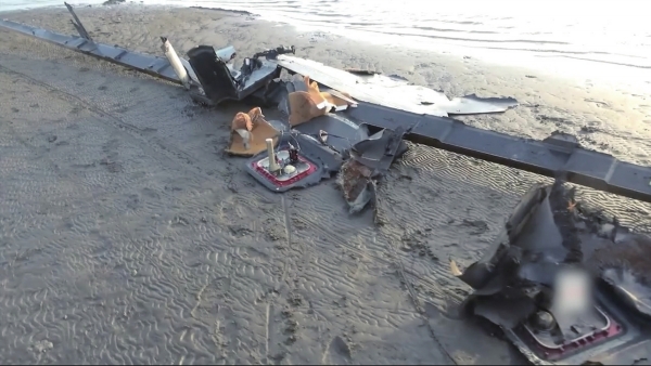 这张2月20日的视频截图显示的是,疑似被胡塞武装击落的美国无人机残骸坠落到荷台达的一处海滩上。