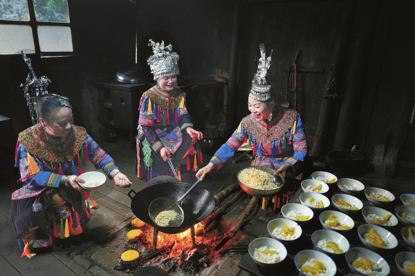 2月21日,通道侗族自治县双江镇向晖村,侗家姑娘围着火塘炸油茶。当天,邻村的客人来向晖村走寨拜年,村民纷纷以香喷喷的油茶款待宾朋。油茶是侗家人的特色美食,也是待客的佳肴。杨芝干 摄(湖南图片库)