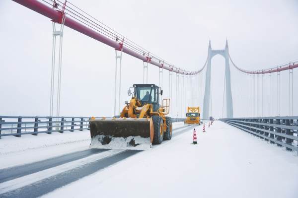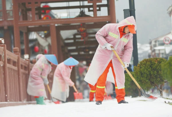 2月22日,张家界市武陵源区,环卫工人在宝峰桥人行道铲雪除冰。