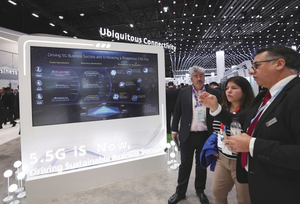 2024年世界移动通信大会正在西班牙巴塞罗那举行。大会期间,在5G技术基础上演进而来的5G-A技术备受关注,一些业界人士认为今年是5G-A商用元年。图为2月28日,在西班牙巴塞罗那举行的2024年世界移动通信大会上,人们在华为展台关注5G-A技术。新华社 发