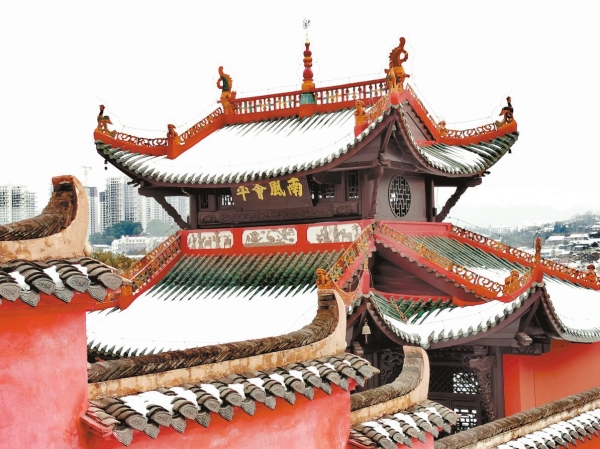 在“唐三藏取经图”砖雕中,人们可以静心聆听玄奘西行的空谷跫音;在二山门,五爪龙纹泥塑护旨,左右麒麟祈福,人们在此幡盖云从,恪守天地永恒的约定……覆盆莲花式柱础、镂空石刻讲经莲花座、硕大承天花上檐梭柱、月梁藻井、门窗雕饰,匠心玲珑,技艺剔透,所有的仪轨范式都显得可圈可点,肃穆堂皇。王阳明虎溪书院致良知,董其昌宝殿清目谢活佛,林则徐借茶辰州撰清联,沈从文追香梦里回芸庐……每一个阴晴未定的春晨和夏夜,虎溪云树上倦归的鸟儿轻轻一叫,祈福的叶子便悄悄拨动光阴。