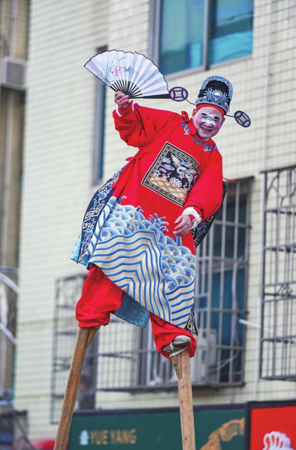 下市街高跷队伍中除了“七品芝麻官”,今年新增的角色“醉关公”也气场全开,收获一众粉丝。扮演者杨求恩看似迈着酒醉的步伐,每一步却稳稳落地,不时豪迈挥刀。