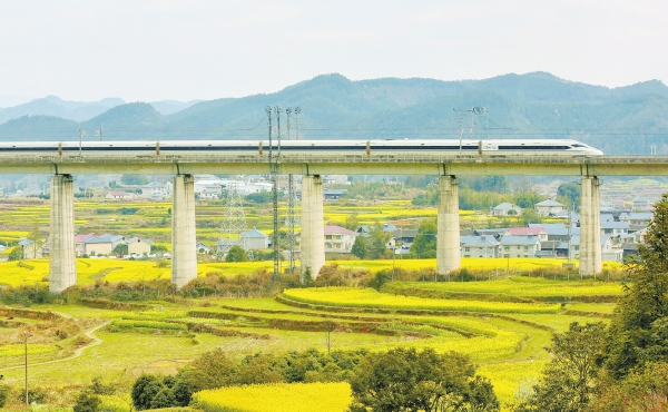 3月13日,沪昆高铁中方县铁路特大桥上飞驰而过的列车,与铁路桥下的村庄、田野构成一幅美好春日画卷。刘亚平 摄(湖南图片库)