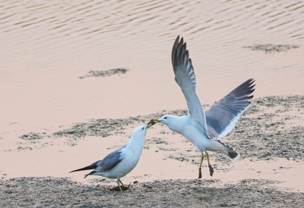3月6日,江苏省连云港市赣榆区,西伯利亚银鸥在浅滩上秀恩爱。西伯利亚银鸥的繁殖地在俄罗斯,是我国一种较常见的冬候鸟。它们飞行轻快而敏捷,有时还会利用空气中的热气流滑翔以节省体力。 |