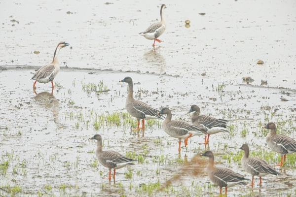 3月4日,安徽省东至县升金湖,两只家鹅(左上)从一群短嘴豆雁前悠然经过。短嘴豆雁繁殖于俄罗斯西伯利亚苔原地带,越冬在我国长江中下游、华东及华南地区。 |