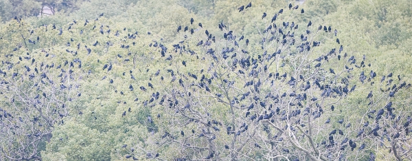 3月3日黄昏,江西省共青城市,秃鼻乌鸦集群迁徙,栖于树林过夜。秃鼻乌鸦俗称老鸹、黑老鸹,繁殖于欧亚大陆中纬度至高纬度地区,越冬于欧亚低纬度地区及北非,在我国分布于东北、华北及长江中下游等地。它们具有较强的社群性,也与其他种类乌鸦混群生活。 |