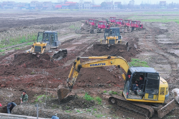 3月16日,南县明山头镇丰安坝村,多台工程机械在高标准农田建设项目现场进行土地平整施工。该项目总面积1050亩,预计在本月底完成施工。
