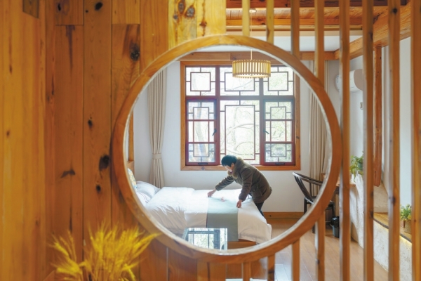 “风格一变,生意立马好转。”沈妙文介绍,2019年,民宿建成的第一个“五一”假期,5间房全部满客。见生意这么好,隔壁的沈妙文弟弟家也申请入伙,把两家房子打通,改造出11间客房。