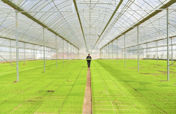 3月19日,浏阳市沿溪镇建设村东联农机专业合作社大棚,工作人员在查看秧苗的生长情况。该市今年将确保粮食播种面积稳定在121.6万亩以上、产量稳定在56.4万吨以上。彭红霞 摄(湖南图片库)
