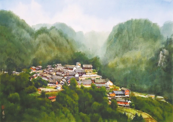 戴永强的水彩画作品《芦笙响起》,以迷离的光影、灵动的笔触,描绘山岭间的人们吹奏芦笙时的场景,展现了宁静与美好的乡村生活。向园的水彩画《夏风》中,运用浪漫主义和象征主义的创作手法,描绘了清澈的湖边、络绎不绝的人们与盘旋飞舞的鸟群,演绎出一曲生命的欢歌。