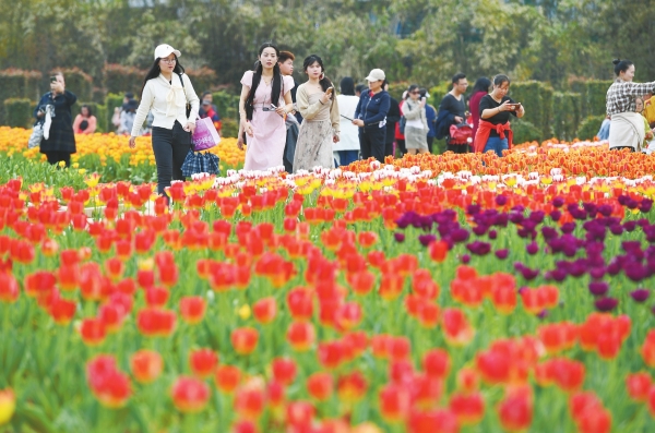 3月23日,湖南省植物园世界名花广场,市民在郁金香花海间赏花游玩。当天长沙晴好,很多市民走出户外,感受春天的美好。