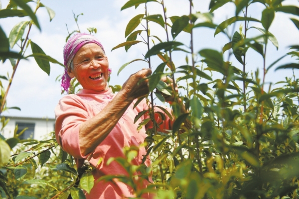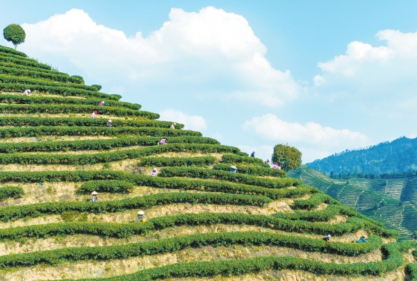 双牌县上梧江瑶族乡盘家村云台山生态有机茶园近日进入春茶采摘期。图为茶农采茶忙。