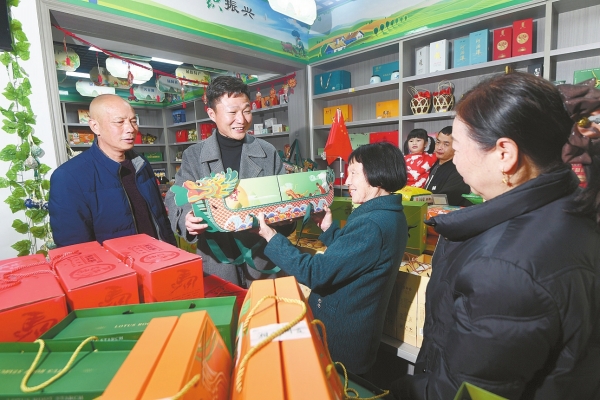 好物推荐 胡魁 3月15日,岳阳市屈原管理区乡村振兴馆,胡魁(左二)为客户推荐本土名优特产。2021年,他回乡创业,致力于让工业品下乡,让农产品进城。他先后获得“湖南省政府采购电子卖场乡村振兴馆产销地仓”“多多买菜”等平台在屈原区、湘阴、汨罗等地的独家运营权。他的乡村振兴馆里陈列的100多种农副产品,有80%是本地产品,去年销售额达到了500万元。 湖南日报全媒体记者 田超 通讯员 罗姣 摄影报道 |
