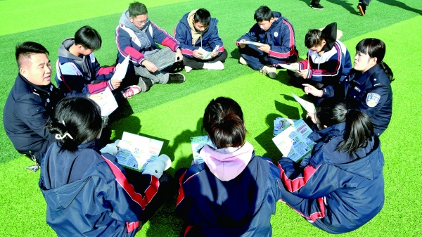 图为课间休息时,民警和新邵县职业中专学生们正围坐在一起,结合一个个鲜活的案例,讲解预防毒品基本常识,并详细介绍了常见毒品种类、特征及危害。(肖斌辉 隆智超)
