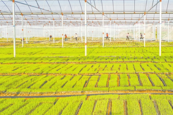 3月26日,蓝山县塔峰镇花果园村集中育秧工厂,工人在搬运秧盘。今年,该县加快集中育秧设施建设,推广工厂化育秧、机械化插秧及农业社会化服务,促进粮食生产提质增效。彭华 摄(湖南图片库)