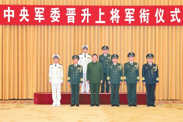 晋衔仪式在嘹亮的军歌声中结束。随后,习近平等领导同志同晋升上将军衔的军官合影。