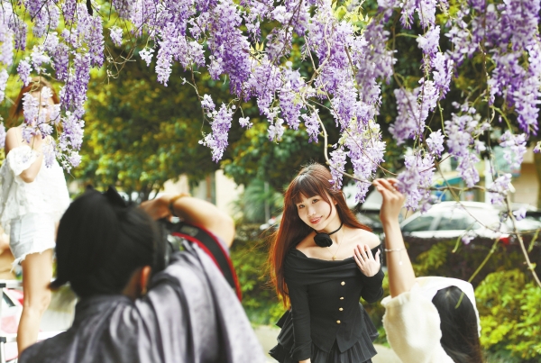 4月2日,长沙市湘府西路保利花园入口处,市民在紫藤花边拍照。此处100多米长的小坡上,紫藤花如瀑布般绽放,将整个小坡装点得如诗如画。