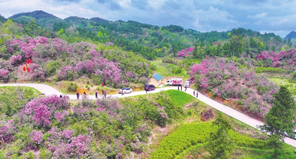 4月8日,凤凰县腊尔山镇科茸村,漫山遍野的杜鹃竞相绽放,吸引众多游客前来踏春赏花。