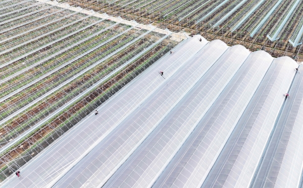 4月12日,澧县城头山镇周家坡社区,工人在智慧葡萄园给葡萄架覆膜。近年来,该县在城头山旅游景区内打造集应用水肥一体化、生产数据化、生产环境智能化三大管理系统于一体的智慧葡萄园,示范引领全县葡萄产业转型升级,提高产业效益,助力农民稳定增收。