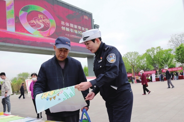 在4月15日第九个全民国家安全教育日到来前,各地开展形式多样的国家安全教育主题活动,提高人们的国家安全意识。图为4月13日,民警在山东省枣庄市市中区一处广场向市民宣传国家安全知识。新华社 发