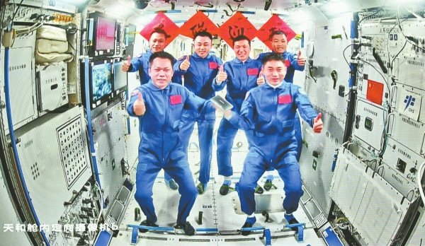 据中国载人航天工程办公室消息,在载人飞船与空间站组合体成功实现自主快速交会对接后,神舟十八号航天员乘组从飞船返回舱进入轨道舱。这是4月26日在北京航天飞行控制中心拍摄的神舟十七号航天员乘组和神舟十八号航天员乘组“全家福”。新华社 发