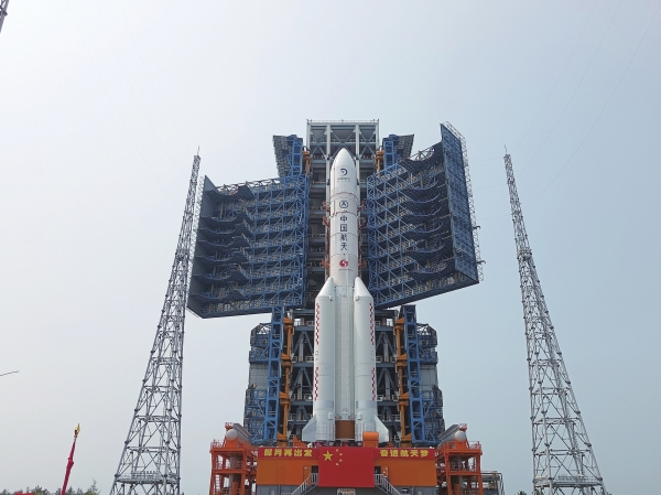 嫦娥六号探测器、长征五号遥八运载火箭分别于1月、3月运抵发射场后,陆续完成总装、测试等各项准备工作。4月27日,承载着长征五号遥八运载火箭的活动发射平台,缓缓将器箭组合体从垂直测试厂房安全转运至发射区(见右图)。后续将按计划开展各项功能检查、联合测试、推进剂加注等工作。